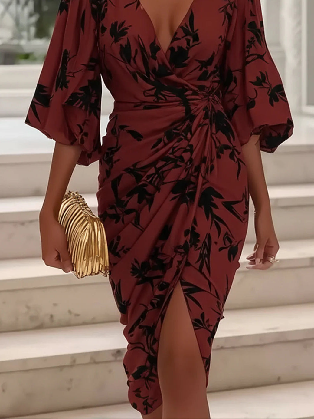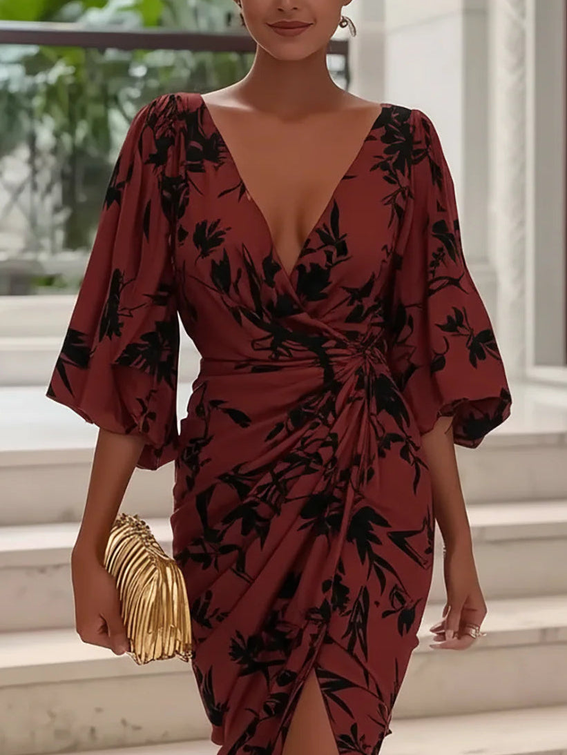 Burgundy Midi Dress With Black Floral Print And Deep V Neck