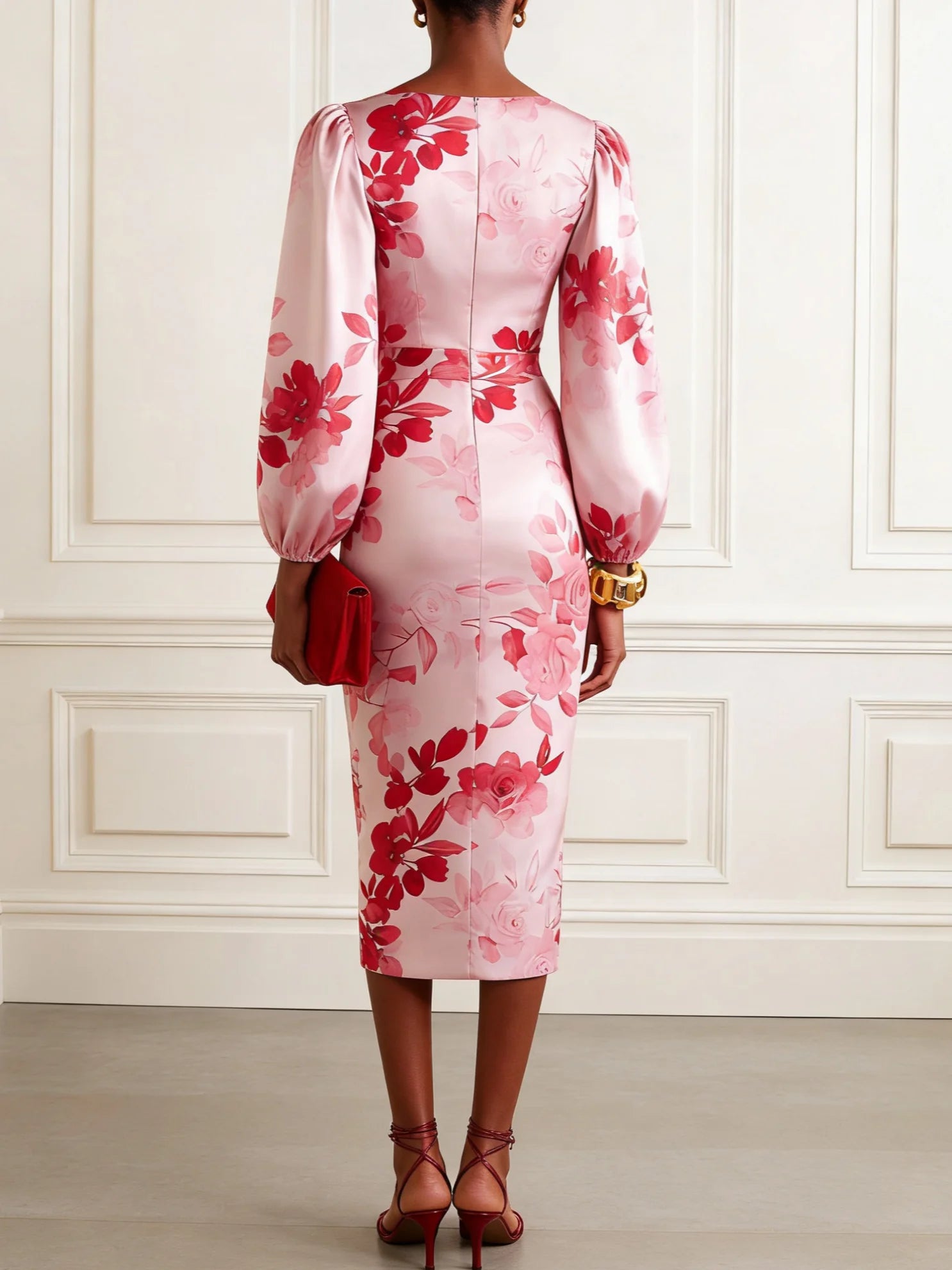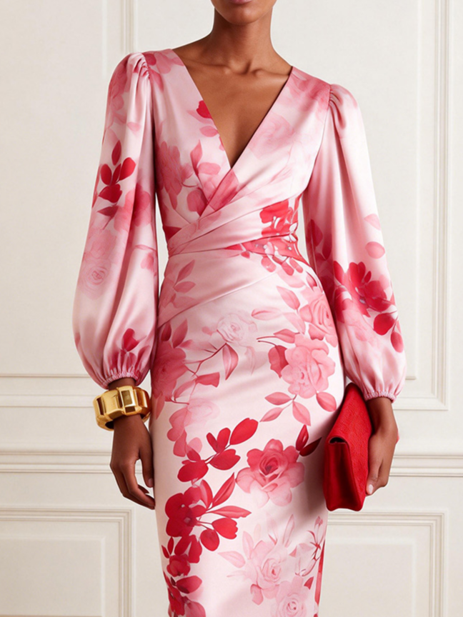 Pink Floral Satin V Neck Balloon Sleeve Sheath Midi Dress