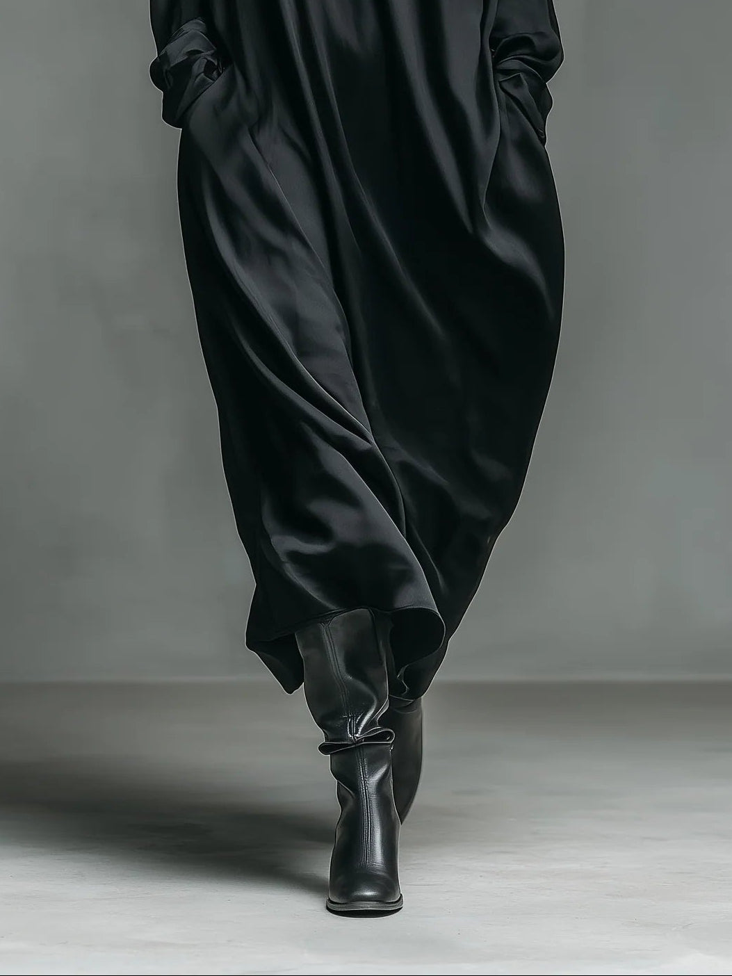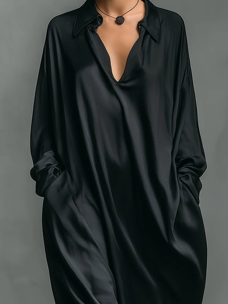 Casual Black Glossy Satin Long-sleeved Loose-fitting Maxi Dress