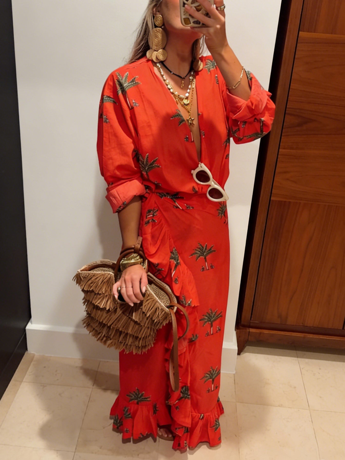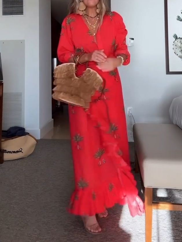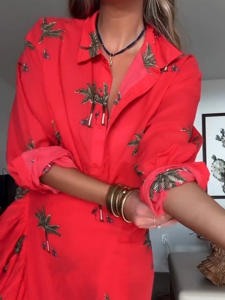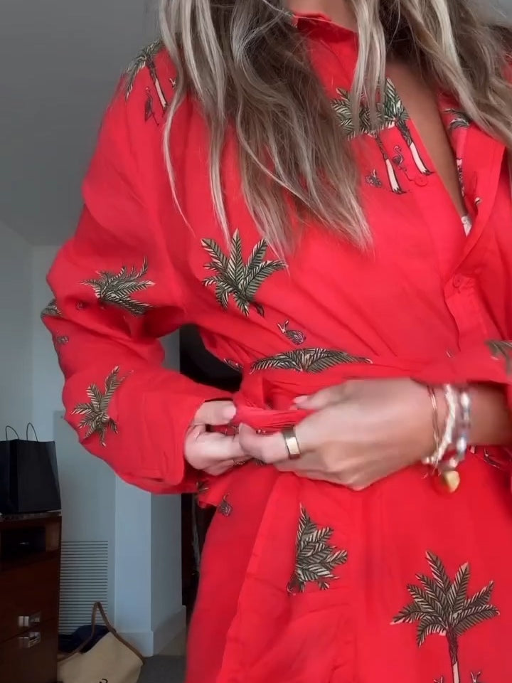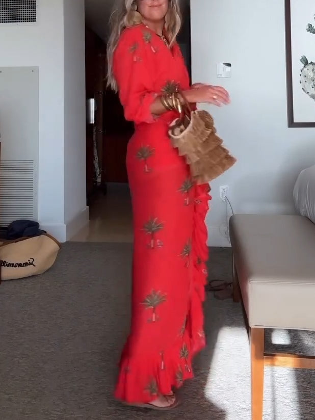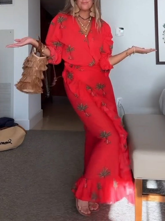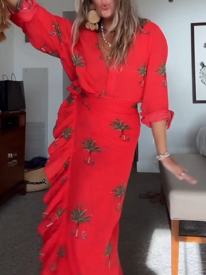 Red Palm Tree Print Shirt And Wrap Vacation Maxi Dress Set