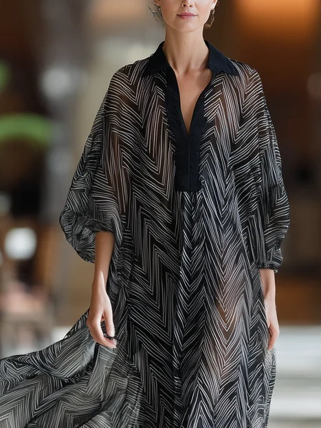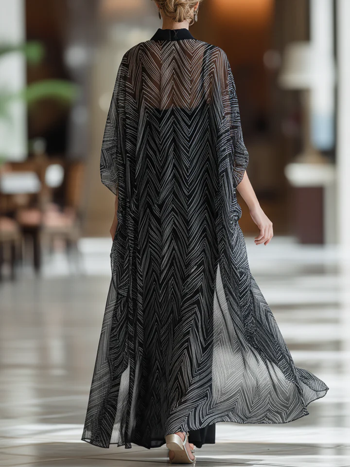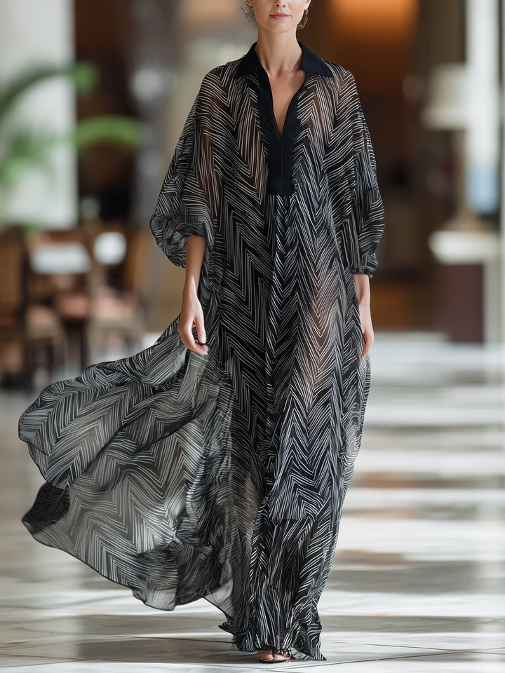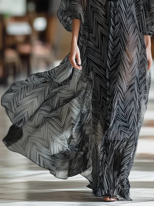 Black Herringbone Print Sheer Maxi Dress