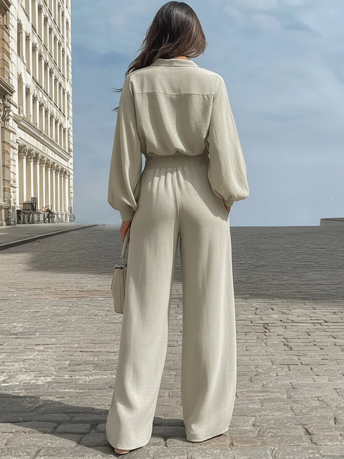 Cream Blouse With Bow And Wide-Leg Pants Set
