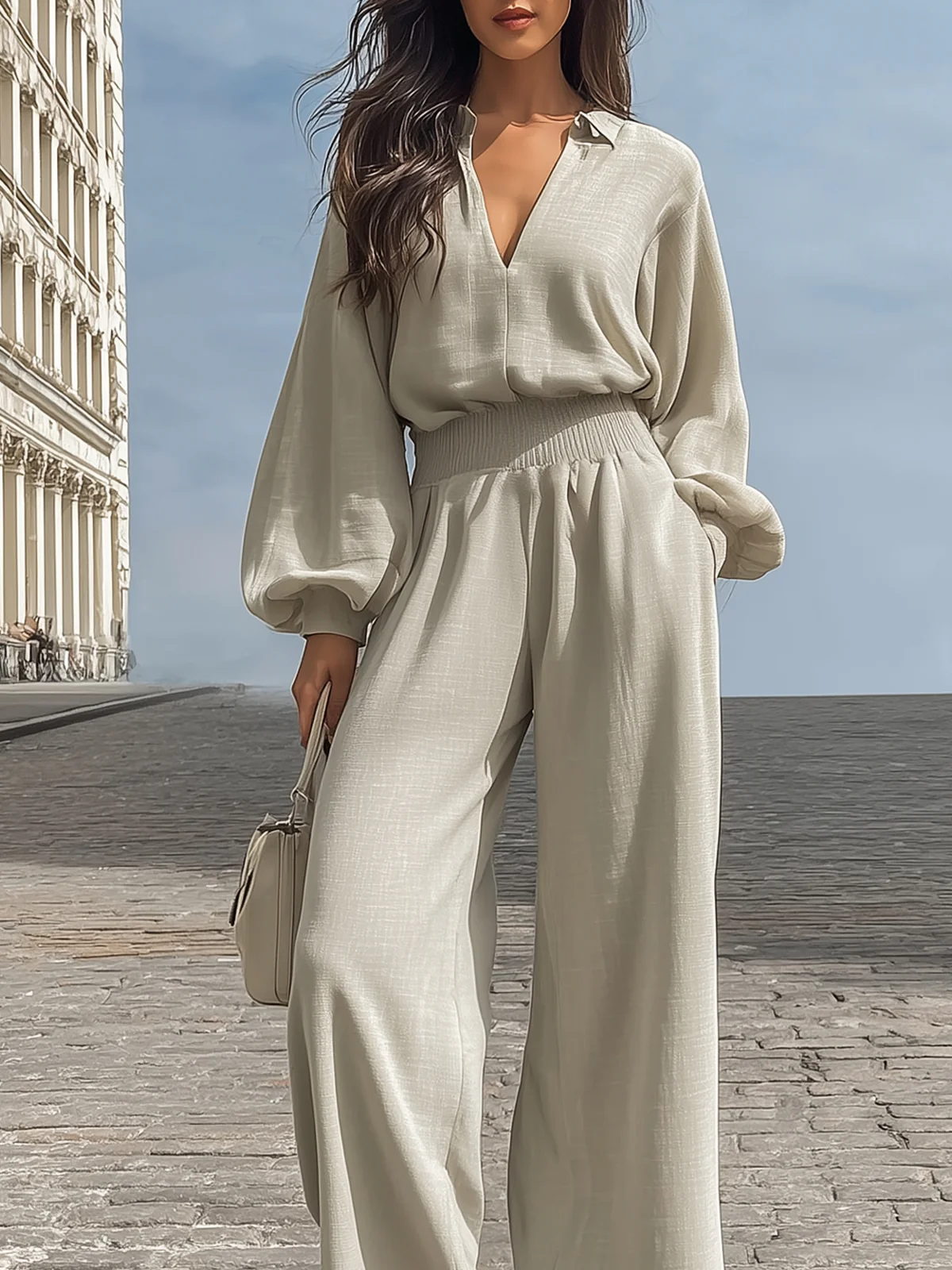 Grey-green Lantern-sleeved V-neck Shirt And Wide-leg Pants Set
