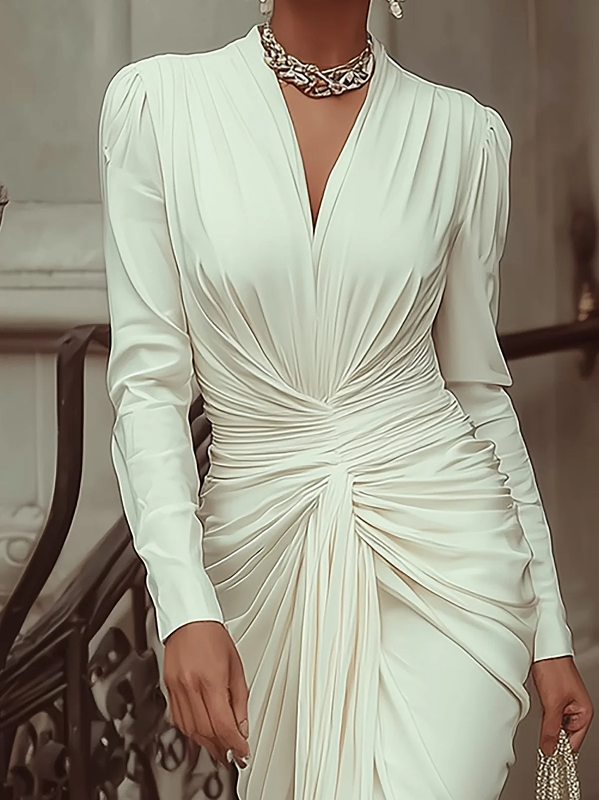 Elegant V-neck pleated long-sleeved dress with a fitted waist