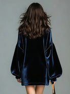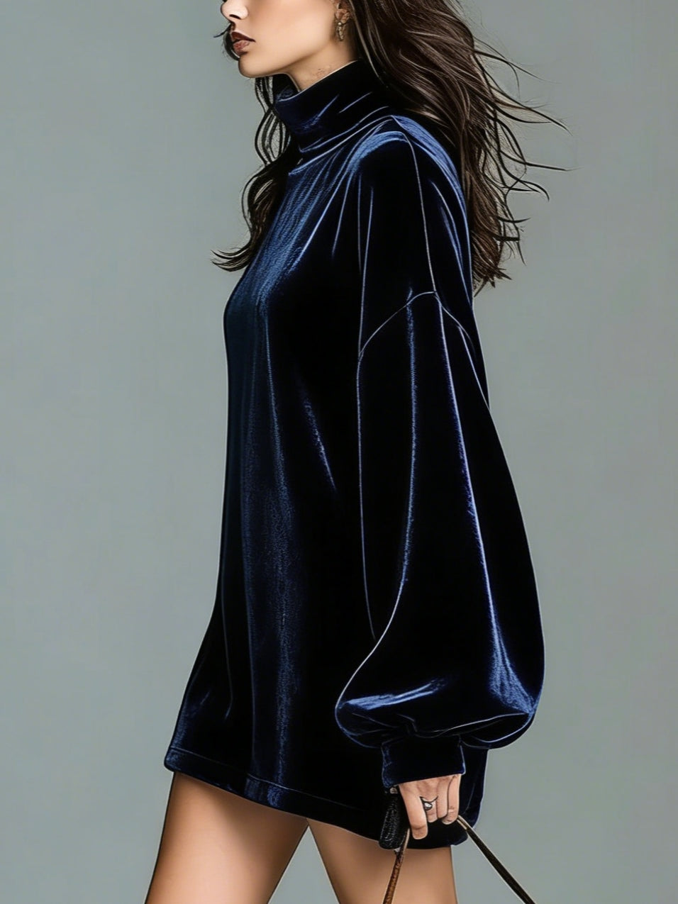 Navy Turtleneck Loose Long Lantern Sleeve Velvet Mini Dress