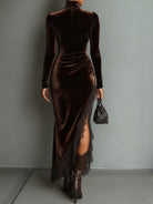 Chocolate Velvet Irregular Hem Lace Fitted Maxi Dress