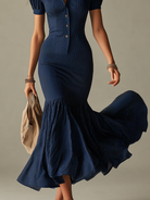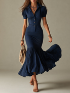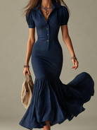 Navy Blue Striped Shirt Collar Slim-fit Mermaid Midi Dress